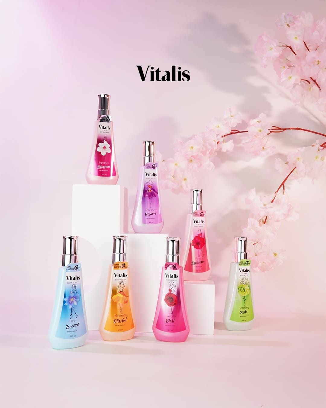 - Vitalis Luxury Body Scent Blooming Blissful: Perpaduan plum, pear, ylang, musky, dan patchouli yang memancarkan nuansa manis, hangat, dan sedikit misterius.