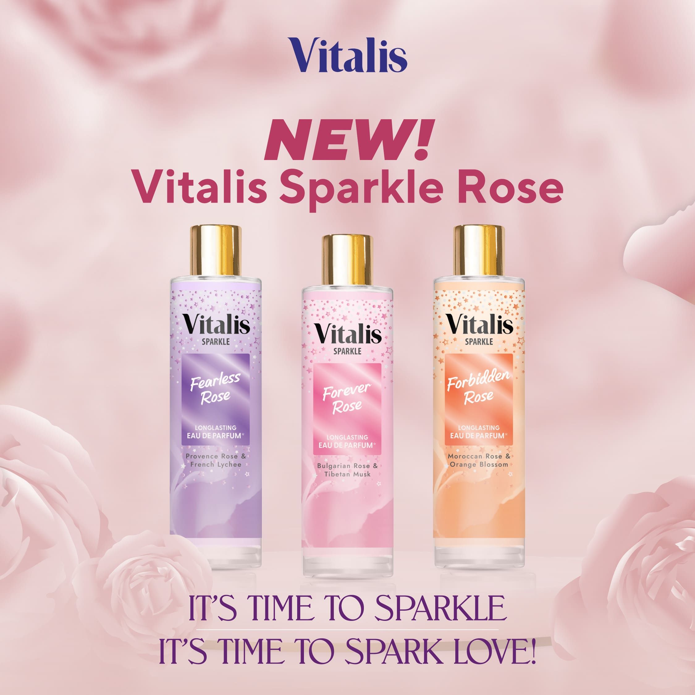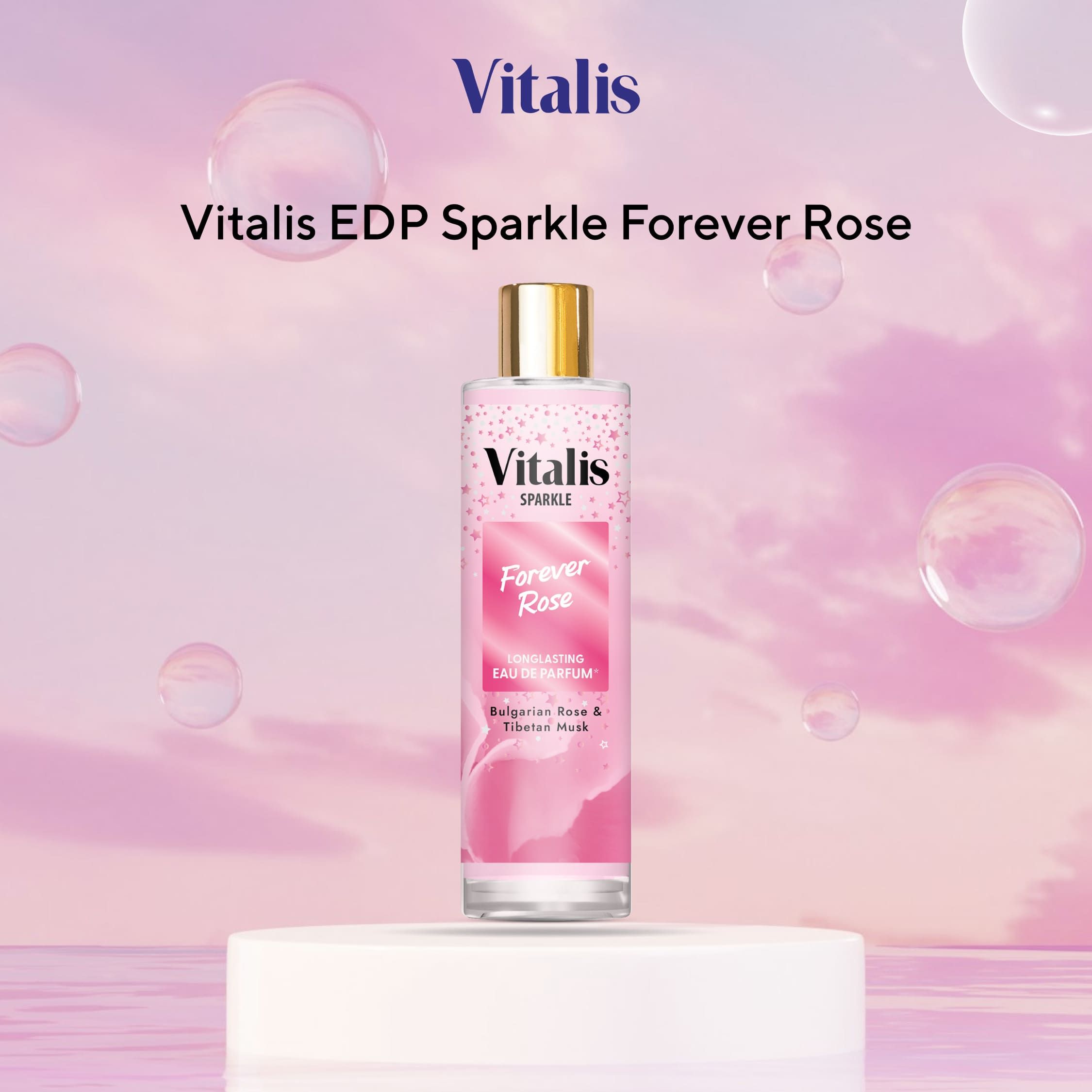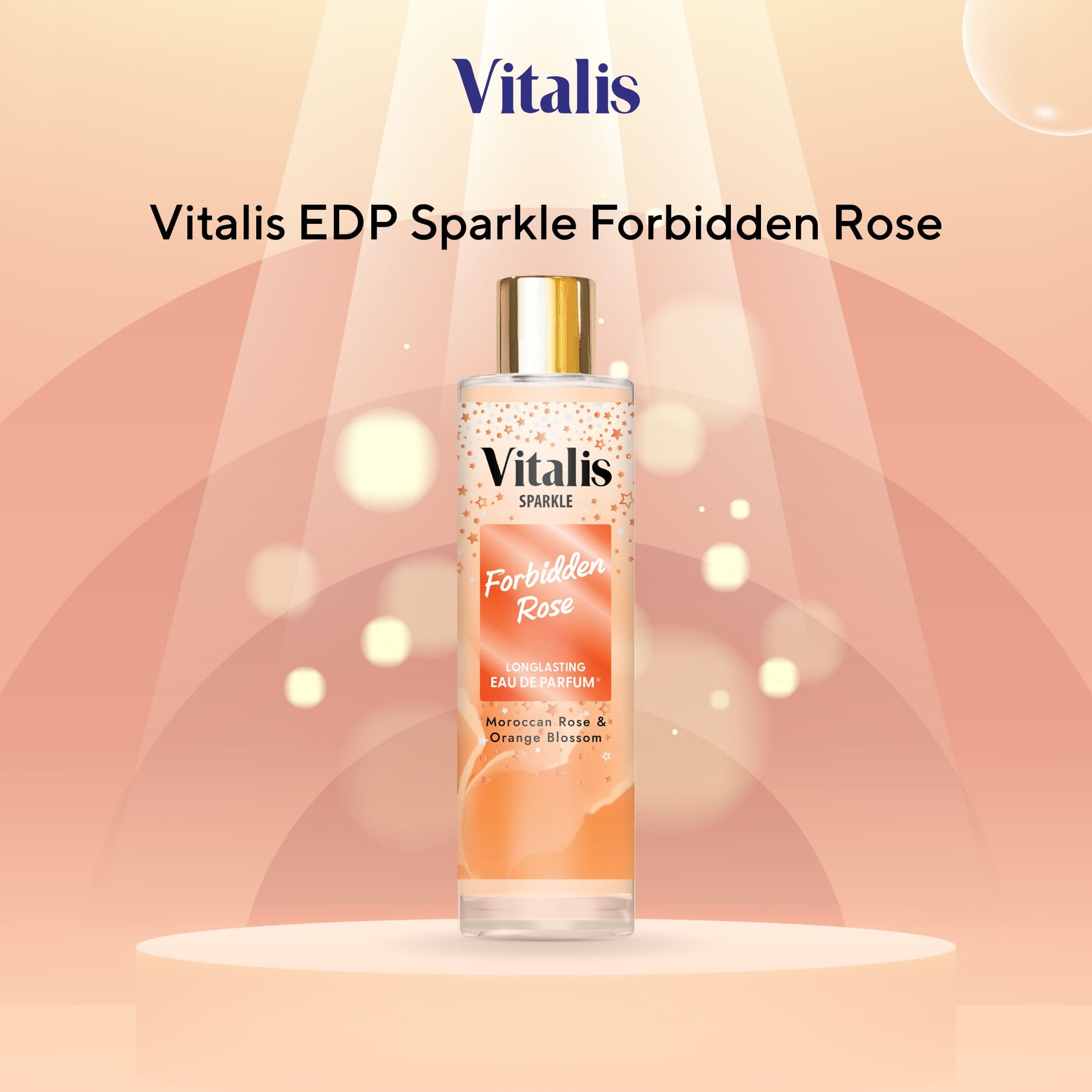• Vitalis EDP Sparkle Forever Rose - Perpaduan pear, violet, dan cream almond di awal, dilanjutkan dengan rose, carnation, dan lily of the valley yang feminin. Ditutup dengan patchouli, vanilla, dan musk yang mewah dan elegan.